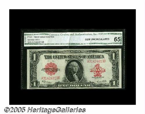 <B>Fr. 40 $1 1923 Legal Tender CGA Gem Uncirculated 65.</B></I> The deep embossing is readily apparent through the CGA holder.