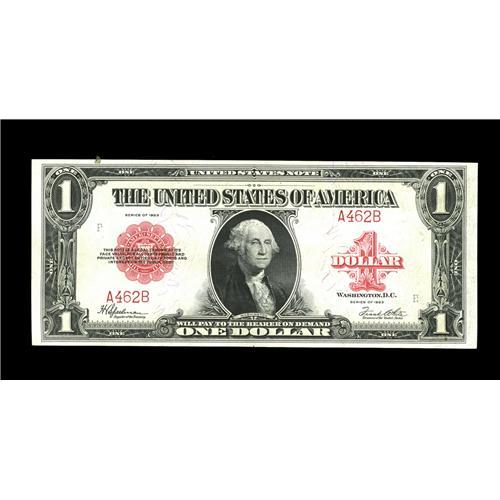 <B>Fr. 40 $1 1923 Legal Tender Choice New.</B></I> A pre-printing paper crinkle attests to the originality of this three-digit serial numbered $1 Legal that is listed in the Gengerke census, but without a grade or any data. Ample margins surround this note that has a counting mark in the vicinity of the upper right-hand corner. Still a beautiful note.