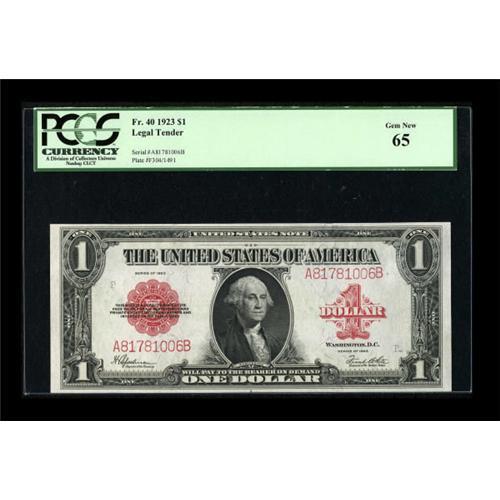 <B>Fr. 40 $1 1923 Legal Tender PCGS Gem New 65.</B></I> Pleasing margins and great original color with blazing inks are noticed on this red seal.<BR><BR><b>Shipping:</b> Coins & Currency (<a target="_blank" href="http://www.heritageauctions.com/common/shipping.php">view shipping information</a>)