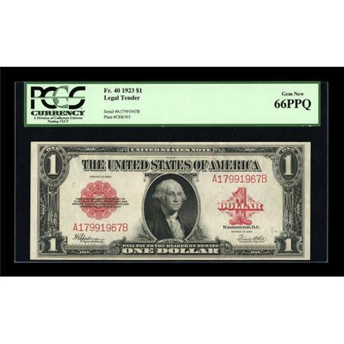 <B>Fr. 40 $1 1923 Legal Tender PCGS Gem New 66PPQ.</B></I> A handsome example with the margins and color that one would expect from a high end Gem. <BR><I>From The Drew Keough Collection</B></I><BR><BR><b>Shipping:</b> Coins & Currency (<a target="_blank" href="http://www.heritageauctions.com/common/shipping.php">view shipping information</a>)