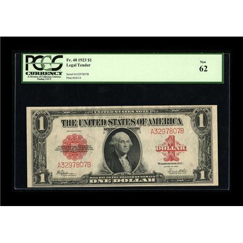 <B>Fr. 40 $1 1923 Legal Tender PCGS New 62.</B></I> This colorful Red Seal exhibits surfaces which are a bit toned and margins that are a tad uneven.