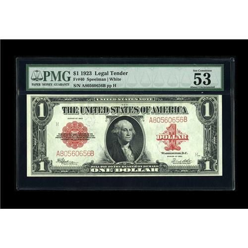 <B>Fr. 40 $1 1923 Legal Tender PMG About Uncirculated 53 EPQ.</B></I> Nothing more than a bit of handling and a soft horizontal bend account for the grade on this note. The overprint is as bold as any CU note would exhibit.<BR><BR><b>Shipping:</b> Coin/Currency (<a target="_blank" href="http://www.heritageauctions.com/common/shipping.php">view shipping information</a>)