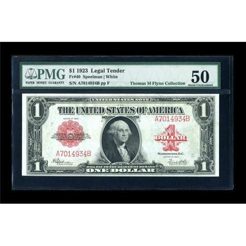<B>Fr. 40 $1 1923 Legal Tender PMG About Uncirculated 50.</B></I> A solid AU that carries the full eye appeal of a Choice New example. <BR><I>From The Thomas M. Flynn Collection</B></I><BR><BR><b>Shipping:</b> Coins & Currency (<a target="_blank" href="http://www.heritageauctions.com/common/shipping.php">view shipping information</a>)