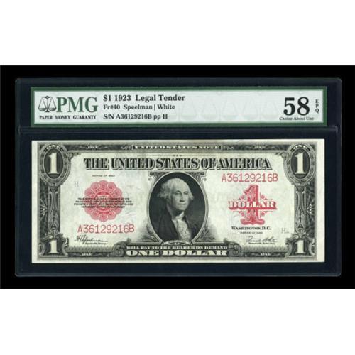 <B>Fr. 40 $1 1923 Legal Tender PMG Choice About Unc 58 EPQ.</B></I> Beautifully margined with all the attributes of a Gem save for a single broad corner-fold at the lower right.<BR><BR><b>Shipping:</b> Coins & Currency (<a target="_blank" href="http://www.heritageauctions.com/common/shipping.php">view shipping information</a>)