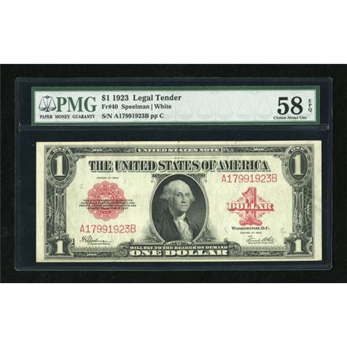 <B>Fr. 40 $1 1923 Legal Tender PMG Choice About Unc 58 EPQ.</B></I> A light center bend is noted on this otherwise perfectly original and well embossed note.<BR><I>From The Warren Marshall Collection</B></I><BR><BR><b>Shipping:</b> Coins & Currency (<a target="_blank" href="http://www.heritageauctions.com/common/shipping.php">view shipping information</a>)