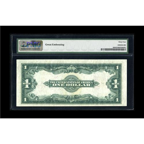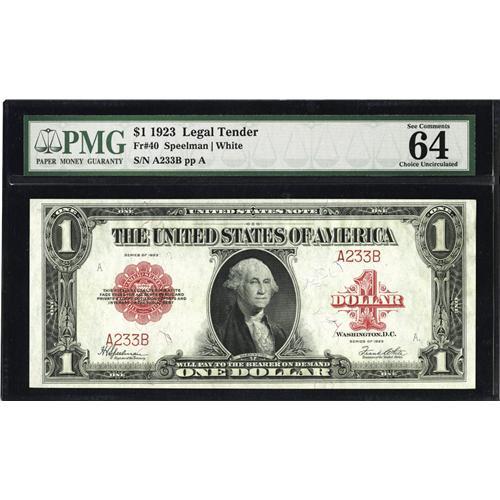<B>Fr. 40 $1 1923 Legal Tender PMG Choice Uncirculated 64.</B></I> Serial Number A233B. This brightly colored Legal Tender is even more appealing because of its three digit serial number.