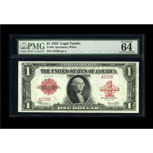 <B>Fr. 40 $1 1923 Legal Tender PMG Choice Uncirculated 64.</B></I> Serial Number A233B. This brightly colored Legal Tender is even more appealing because of its three digit serial number. The comment "Great Embossing" was added by PMG graders.<BR><BR><b>Shipping:</b> Coin/Currency (<a target="_blank" href="http://www.heritageauctions.com/common/shipping.php">view shipping information</a>)