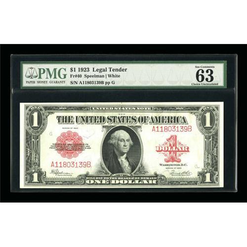 <B>Fr. 40 $1 1923 Legal Tender PMG Choice Uncirculated 63 EPQ.</B></I> Although this is not the note used for the illustration, this type is shown on page 57 of the Dauers' book. In that book, the Dauers point out "This was the last large size legal tender note issued before the change to the current small size notes. The portrait of George Washington is the same one used on current one-dollar notes."<BR><I>From The Dr. Edward & Joanne Dauer Collection</B></I><BR><BR><b>Shipping:</b> Coins & Currency (<a target="_blank" href="http://www.heritageauctions.com/common/shipping.php">view shipping information</a>)