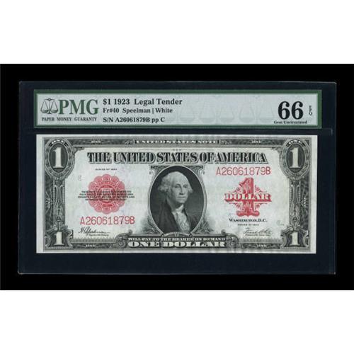 <B>Fr. 40 $1 1923 Legal Tender PMG Gem Uncirculated 66 EPQ.</B></I> Nice even margins and vibrant inks highlight this one year type issue in a desirable grade.<BR><BR><b>Shipping:</b> Coins & Currency (<a target="_blank" href="http://www.heritageauctions.com/common/shipping.php">view shipping information</a>)