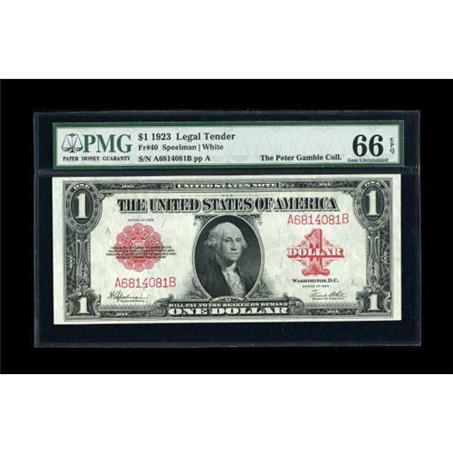 <B>Fr. 40 $1 1923 Legal Tender PMG Gem Uncirculated 66 EPQ.</B></I> An outstanding example of this relatively available Large Size Twentieth Century Legal. The broad margins, ideal embossing, and perfect paper colors of this piece have earned it the 66 EPQ designation.<BR><I>From The Peter Gamble Collection.</B></I><BR><BR><b>Shipping:</b> Coins & Currency (<a target="_blank" href="http://www.heritageauctions.com/common/shipping.php">view shipping information</a>)