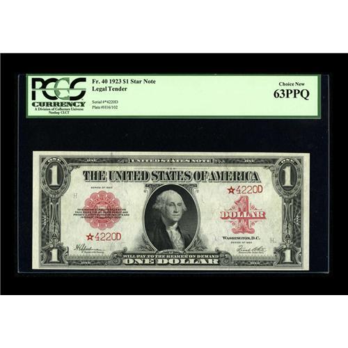 <B>Fr. 40 $1 1923 Legal Tender Star Note PCGS Choice New 63PPQ.</B></I> A real beauty of a replacement with plenty of deep embossing visible and a desirable four digit serial number. It has been a few sales since we have offered one of these.<BR><BR><b>Shipping:</b> Coin/Currency (<a target="_blank" href="http://www.heritageauctions.com/common/shipping.php">view shipping information</a>)