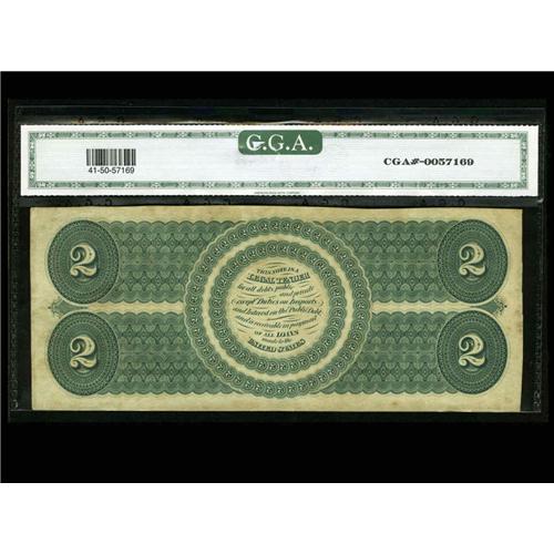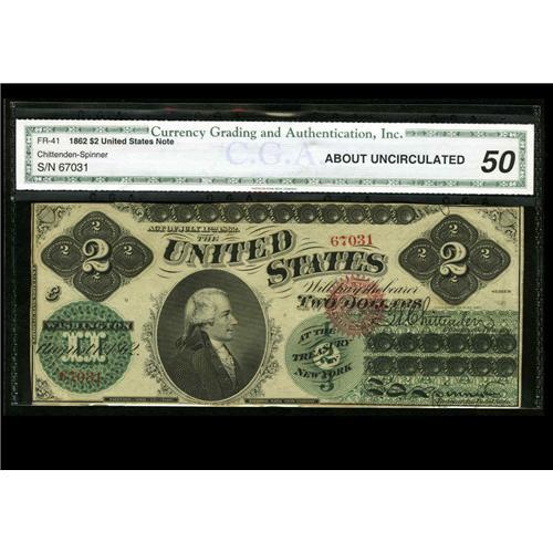 <B>Fr. 41 $2 1862 Legal Tender CGA About Uncirculated 50.</B></I> The ink colors are very strong, but the paper is lightly toned.
