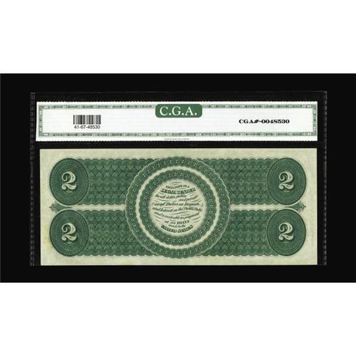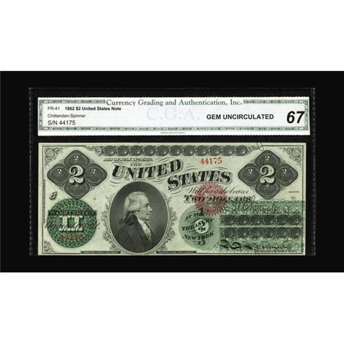 <B>Fr. 41 $2 1862 Legal Tender CGA Gem Uncirculated 67.</B></I> This is the highest third-party graded note we have been able to offer for this Friedberg number. It has white paper, rich inks, and nice margins. A great example of our nation's first Deuce.