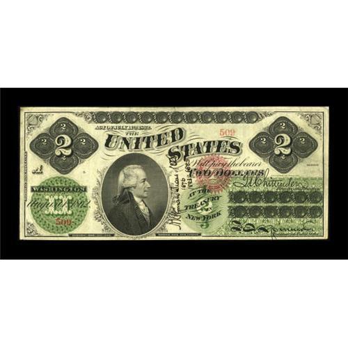 <B>Fr. 41 $2 1862 Legal Tender Courtesy Autograph Extremely Fine.</B></I> AU Wyman has signed the note vertically to the right of the Hamilton portrait on three lines "AU Wyman Treas of US--1876--1883-1885." The note is a decent XF, but it has a number of margin splits and a longer tear at the top center. There is also a bit of ink erosion in the "1885" date of the courtesy autograph.<BR><BR><b>Shipping:</b> Coins & Currency (<a target="_blank" href="http://www.heritageauctions.com/common/shipping.php">view shipping information</a>)