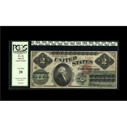 <B>Fr. 41 $2 1862 Legal Tender PCGS Very Fine 20.</B></I> The design on this note is bold and unbroken by the folds it received in the Civil War era channels of commerce. Moreover, the seal and serial numbers are bright. This design is listed as No. 88 in the book <I>100 Greatest American Currency Notes.</B></I><BR><I>From The Troy Wiseman Collection</B></I>