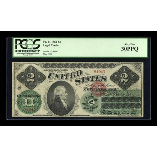 <B>Fr. 41 $2 1862 Legal Tender PCGS Very Fine 30PPQ.</B></I> This early Deuce would be considered to have excellent color even if it were uncirculated. As a Very Fine, the color is simply outstanding. The PPQ comment is not often seen at this grade level, and it is an additional assurance that the quality of this piece is unusually high.<BR><BR><b>Shipping:</b> Coins & Currency (<a target="_blank" href="http://www.heritageauctions.com/common/shipping.php">view shipping information</a>)