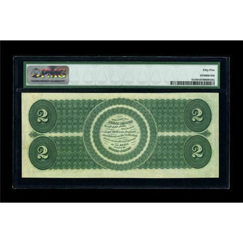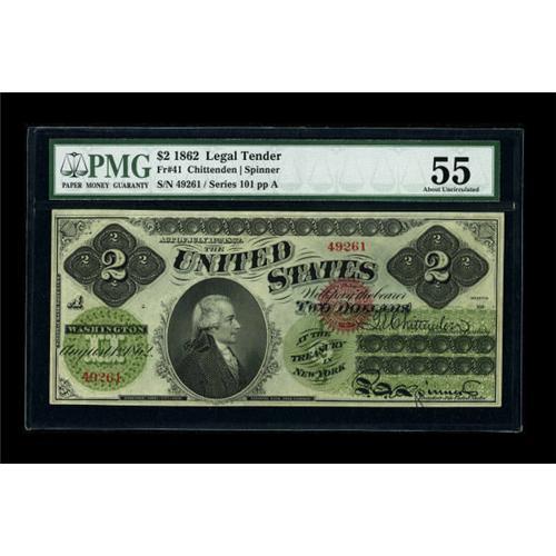 <B>Fr. 41 $2 1862 Legal Tender PMG About Uncirculated 55.</B></I> We offer another pleasingly original piece which was hidden away for many years. The cause for the grade is difficult to detect, but we are confident that there is a fold present that accounts for it.<B><BR></B></I><I>From The John Ameen Collection</B></I><BR><BR><b>Shipping:</b> Coins & Currency (<a target="_blank" href="http://www.heritageauctions.com/common/shipping.php">view shipping information</a>)