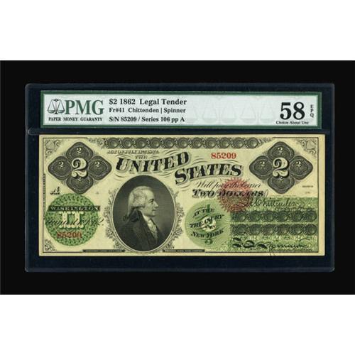 <B>Fr. 41 $2 1862 Legal Tender PMG Choice About Unc 58 EPQ.</B></I> Certainly a fresh deuce which should finish closer to a realization for a New note, as a center fold is all that affects the surface. Off the market for many years and unreported until now, expect this vibrant example to hammer in the area of...<B><BR></B></I><I>From The Warren Marshall Collection</B></I><BR><BR><b>Shipping:</b> Coins & Currency (<a target="_blank" href="http://www.heritageauctions.com/common/shipping.php">view shipping information</a>)