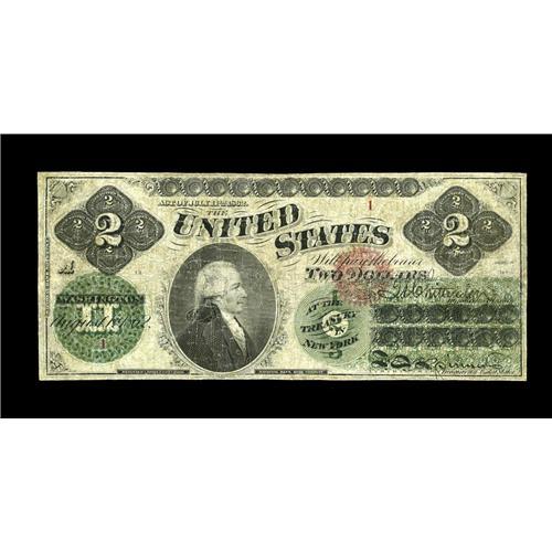 <B>Fr. 41 $2 1862 Legal Tender Serial Number 1 Very Good.</B></I> This note has been sold publicly twice before: by Stack's in 1995, and by CAA in September of 1997. Since the last time we have sold it multiple edge nicks have been extremely well repaired, so well, in fact, that even while holding the old photo of the note before it had the repairs done, the repairs are still hard to discern. Unlike Ones and Fives, Serial Number 1 Deuces of this early design type are few and far between. This note, while clearly well circulated, still has a rather handsome appearance, and it should bring a very solid price.<BR><I>From The Ross Bailey Collection</B></I>