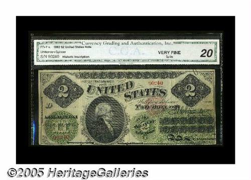 <B>Fr. 41a $2 1862 Legal Tender CGA Very Fine 20, Splits.</B></I> What would otherwise be a rather ordinary type note has considerable additional interest due to its bold historic inscription on the back, "Sent by Thos. W. Brown, Harrisburg, Pa. to G.T. Brown - Virginia, Nev. 1863." A great Old West connection to an extremely historic town. The basic note would be a $500-or-so item, but we feel this particular inscription should carry it to about double that.