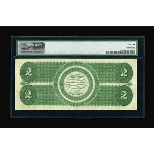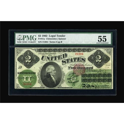 <B>Fr. 41a $2 1862 Legal Tender PMG About Uncirculated 55.</B></I> A boldly printed example of one of this country's earlier design types. The paper remains bright and the inks are very deep.<B><BR></B></I><I>From The Warren Marshall Collection</B></I><BR><BR><b>Shipping:</b> Coins & Currency (<a target="_blank" href="http://www.heritageauctions.com/common/shipping.php">view shipping information</a>)