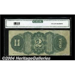 Fr. 42 $2 1869 Legal Tender CGA Extremely Fine 40, Restored. An edge split has been repaired, and the upper right corner tip outside of the design area has been replaced. The overall appearance is quite nice, and the note is likely to prove to be a good purchase for a collector seeking a pleasing appearance without the high price. <BR><BR><B>Important notice:</B> Heritage usually auctions material at the rate of 200-250 lots per hour. On some occasions eBay Live bid software or the Internet may not be able to keep up with the pace of the auction. We recommend placing a realistic absentee bid now as insurance to avoid disappointment. Occasionally the auctioneer may eliminate or reject an eBay Live bid, and the auctioneer may also reopen a lot after the close of the eBay live bidding (usually because we missed an audience bid), and may reject your bid even if it shows you as the winning bidder. By bidding via eBay Live, you agree that Heritage may award the lot to another bidder at its sole discretion under the circumstances described above or any other reasonable circumstances. Since eBay bids are not shown to us until we open the lot on the floor, we treat those bids just like floor bids. In most cases the floor responds before the eBay bid is presented to us, due to Internet lag time, so for consistency we have made it a policy that floor bids are always considered first over tie eBay live bids. Also please note that all Heritage lots purchased through eBay Live carry a 20% Buyer's Premium. Please make sure you read the Terms and Conditions before you bid. <BR><BR><B>IMPORTANT ANNOUNCEMENT ABOUT RESERVES:</B> Heritage now divulges all reserves on its web site 7 days before every auction. If you want to know whether the reserve on this lot has been met, and if not, what the reserve amount is, please visit this lot page on the HeritageCoin.com web site, or email: bid@HeritageGalleries.com