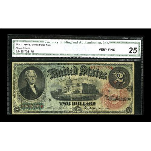 Fr. 42 $2 1869 Legal Tender CGA Very Fine 25. A handsom Fr. 42 $2 1869 Legal Tender CGA Very Fine 25