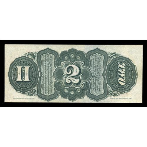 <B>Fr. 42 $2 1869 Legal Tender New.</B></I> The colors are beautiful on this Rainbow Deuce, and the original surfaces show their embossing very nicely. The note does have an annoying, though not immediately visible problem: a hole has been closed and re-colored. It falls in a spot where it's not immediately seen. It's in the body of the stagecoach in the foreground of the vignette on the face. On the back, it's buried in the busy design. Nonetheless, the would-be $5000 value of this note is affected considerably.