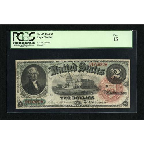 <B>Fr. 42 $2 1869 Legal Tender PCGS Fine 15.</B></I> This is a very attractive and original Rainbow Deuce with all the eye appeal of a full VF.<BR><BR><b>Shipping:</b> Coins & Currency (<a target="_blank" href="http://www.heritageauctions.com/common/shipping.php">view shipping information</a>)