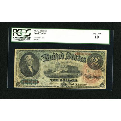 <B>Fr. 42 $2 1869 Legal Tender PCGS Very Good 10.</B></I> This Rainbow still displays the color this issue is known for.<BR><I>From The Kansas City Collection</B></I><BR><BR><b>Shipping:</b> Coins & Currency (<a target="_blank" href="http://www.heritageauctions.com/common/shipping.php">view shipping information</a>)