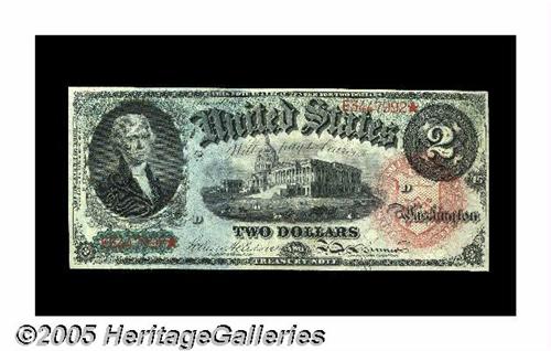 <B>Fr. 42 $2 1869 Legal Tender Very Choice New.</B></I> One of the nicest Rainbow Deuces we've seen in some time. The colors simply can not be improved on and the original embossing is unmoloested and fully intact. While the centering is attractive, with just a rumor more margin at right this superior example would qualify as a Gem. <BR><I>From the Sedona Collection.</B></I>