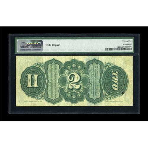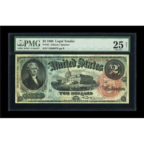 <B>Fr. 42 $2 1869 Legal Tender PMG Very Fine 25 Net.</B></I> This Rainbow is a new addition to the census, with a repaired hole as the only notable mark. The anti-counterfeiting swath of blue is especially deep.<BR><BR><b>Shipping:</b> Coins & Currency (<a target="_blank" href="http://www.heritageauctions.com/common/shipping.php">view shipping information</a>)