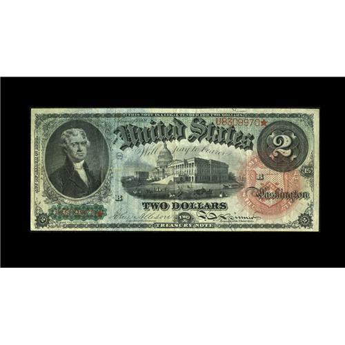 <B>Fr. 42 $2 1869 Legal Tender Very Fine.</B></I> This Rainbow is a new addition to the census, with a repaired hole as the only notable mark. You might have to look awhile on the front; however, the dark green ink on the back helps locate the repair area.