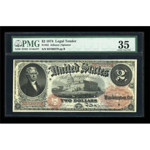 <B>Fr. 43 $2 1874 Legal Tender PMG Choice Very Fine 35.</B></I> This is a bright, lightly handled example of this Deuce. A little over 100 pieces are known.<BR><BR><b>Shipping:</b> Coins & Currency (<a target="_blank" href="http://www.heritageauctions.com/common/shipping.php">view shipping information</a>)