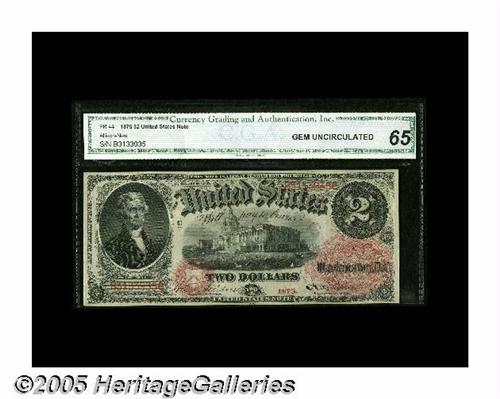 <B>Fr. 44 $2 1875 Legal Tender CGA Gem Uncirculated 65.</B></I> Excellent color with broad face margins. Fr. 44 is a scarcer number with only about sixty examples known in all grades combined - this is clearly one of the nicer ones.