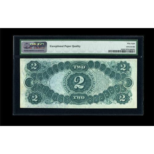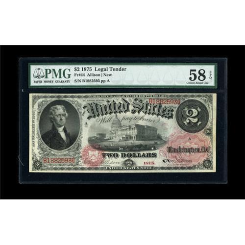 <B>Fr. 44 $2 1875 Legal Tender PMG Choice About Unc 58 EPQ.</B></I> This note exhibits a light corner bend at upper left, otherwise the original surfaces, bright inks and eye appeal would lead you to believe this note is new.<BR><BR><b>Shipping:</b> Coins & Currency (<a target="_blank" href="http://www.heritageauctions.com/common/shipping.php">view shipping information</a>)