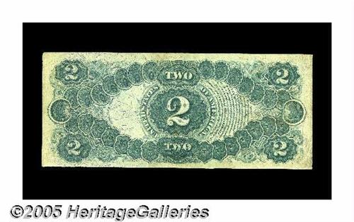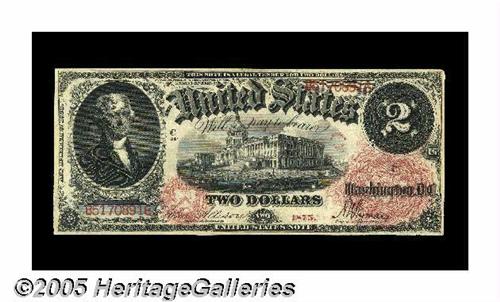 <B>Fr. 47 $2 1875 Legal Tender Choice About Uncirculated.</B></I> A ghost of a center fold is detected on this better Friedberg number that has fewer then 60 examples recorded. Also, excellent color is found on this Deuce that has the upper right-hand corner tip slightly rounded.
