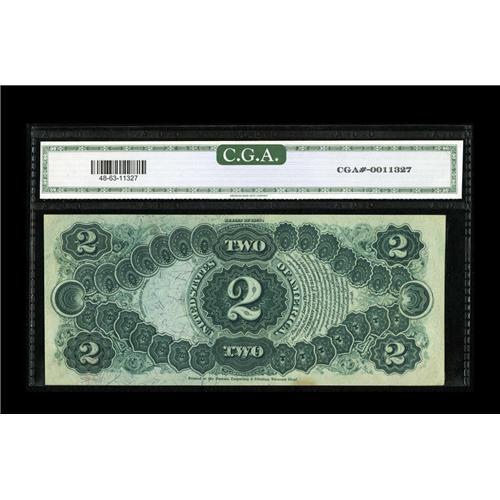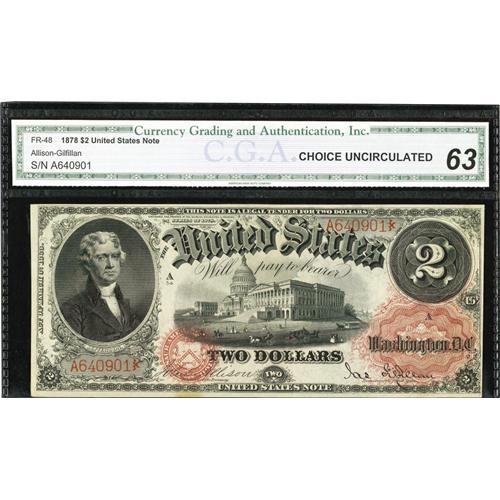 <B>Fr. 48 $2 1878 Legal Tender CGA Choice Uncirculated 63.</B></I> Dark inks for this Deuce that has a small spot below the Treasury Seal.