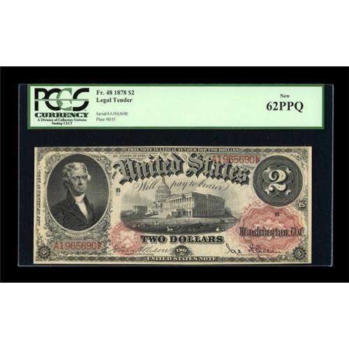 <B>Fr. 48 $2 1878 Legal Tender PCGS New 62PPQ.</B></I> Pleasing paper surfaces are noted on this Deuce. The red overprint is as bright as one will find for the issue.<BR><BR><b>Shipping:</b> Coins & Currency (<a target="_blank" href="http://www.heritageauctions.com/common/shipping.php">view shipping information</a>)