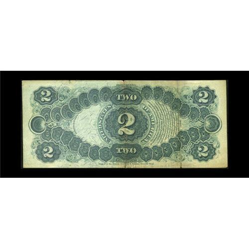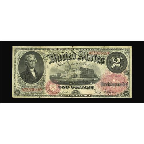 <B>Fr. 49 $2 1878 Legal Tender Fine-Very Fine.</B></I> Last appearing in our FUN 2006 auction, the note was described, "One of the classic rarities of Large Size type, this note, which is new to the Census, raises the number known to 14. It's the first example that Heritage-CAA has sold, and only the third that CAA has handled in its 15 year history. The note appears to have never circulated, but it has three storage folds that are heavy enough to preclude the XF grade. Each of the folds is lightly split at the end. The note is decently margined, with bright ink colors, and good visual appeal. The right-hand side of the back is a bit aged as it apparently was the part exposed during storage. When Fr. 49s are sought, one cannot be particularly fussy. The opportunity to buy this number almost never occurs, and this one, while not a beauty, is certainly a respectable piece."