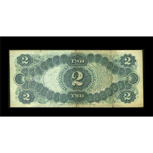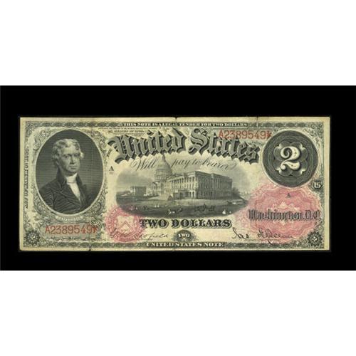<B>Fr. 49 $2 1878 Legal Tender Fine-Very Fine.</B></I> Last appearing in our FUN 2006 auction, the note was described, "One of the classic rarities of Large Size type, this note, which is new to the Census, raises the number known to 14. It's the first example that Heritage-CAA has sold, and only the third that CAA has handled in its 15 year history. The note appears to have never circulated, but it has three storage folds that are heavy enough to preclude the XF grade. Each of the folds is lightly split at the end. The note is decently margined, with bright ink colors, and good visual appeal. The right-hand side of the back is a bit aged as it apparently was the part exposed during storage. When Fr. 49s are sought, one cannot be particularly fussy. The opportunity to buy this number almost never occurs, and this one, while not a beauty, is certainly a respectable piece." A PMG 30 realized $38,000 in March and a PCGS 25 realized just over $16,000 in October of 2005. This note is not in a class with either of those, but it should certainly hit the five-figure mark.<BR><BR><b>Shipping:</b> Coins & Currency (<a target="_blank" href="http://www.heritageauctions.com/common/shipping.php">view shipping information</a>)