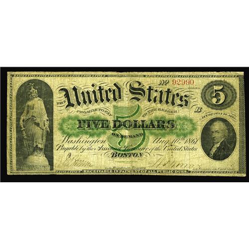 <B>Fr. 3 $5 1861 Demand Note Very Good-Fine.</B></I> This historical piece was issued just days after the Union's defeat at Bull Run. The penned signatures are very much present on this still snappy note that has an approximate one and a half inch skin mark in the back top margin. Only the right-hand margin is inside the frame line of this desirable note from an underrated issue.