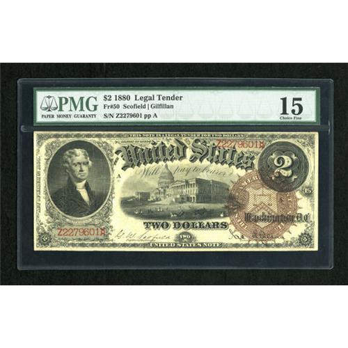 <B>Fr. 50 $2 1880 Legal Tender PMG Choice Fine 15.</B></I> The big brown seal on this Deuce is deeply printed and fully details. The paper is uncompromised and attractive for the grade.<BR><BR><b>Shipping:</b> Coins & Currency (<a target="_blank" href="http://www.heritageauctions.com/common/shipping.php">view shipping information</a>)