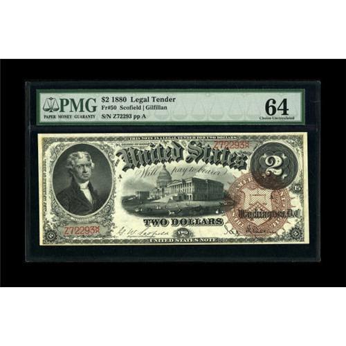 <B>Fr. 50 $2 1880 Legal Tender PMG Choice Uncirculated 64.</B></I> A surprisingly elusive number with only a touch over a hundred examples in the census. PMG has graded four at this level with only one higher. Well margined and with excellent eye appeal.<BR><BR><b>Shipping:</b> Coins & Currency (<a target="_blank" href="http://www.heritageauctions.com/common/shipping.php">view shipping information</a>)