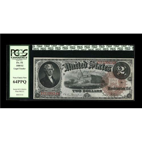 <B>Fr. 51 $2 1880 Legal Tender PCGS Very Choice New 64PPQ.</B></I> A beautiful example of this popular 1880 Deuce Type with the large brown seal and red serial numbers.