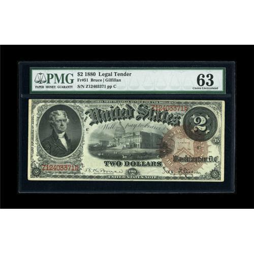 <B>Fr. 51 $2 1880 Legal Tender PMG Choice Uncirculated 63.</B></I> With a little wider top margin this note would have fared better. Lovely print quality along with appealing paper are noticed.<BR><BR><b>Shipping:</b> Coins & Currency (<a target="_blank" href="http://www.heritageauctions.com/common/shipping.php">view shipping information</a>)