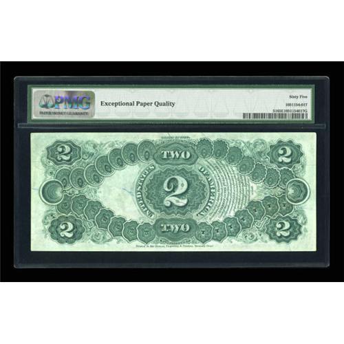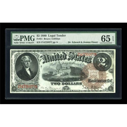 <B>Fr. 51 $2 1880 Legal Tender PMG Gem Uncirculated 65 EPQ.</B></I> This is the Large Brown Seal Red Serial Number Deuce that is used to illustrate the type in the Dauer book. It is fully Gem quality and has been assigned the coveted "Exceptional Paper Quality" comment by PMG. This and two other notes have been graded 65EPQ with only two pieces higher. The colors are terrific on this Large Brown Seal Deuce, which bears the portrait of Thomas Jefferson, our third president. Although Alexander Hamilton was featured on our earliest Deuce, he was soon after replaced with Jefferson, who has been associated with this denomination ever since. Jefferson's home, Monticello, is featured on the back of our small size Deuces. A challenging note to find at this grade level.<BR><I>From The Dr. Edward & Joanne Dauer Collection</B></I><BR><BR><b>Shipping:</b> Coins & Currency (<a target="_blank" href="http://www.heritageauctions.com/common/shipping.php">view shipping information</a>)