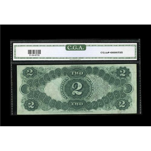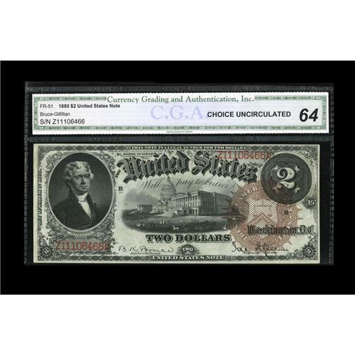 <B>Fr. 51 $2 1880 Legal Tender Very CGA Choice Uncirculated 64.</B></I> Appealing paper and bold embossing are seen clearly through the holder. Save for a faint corner bend, this note would be Gem.