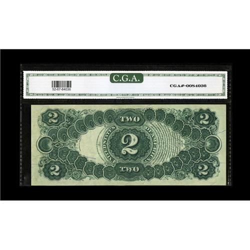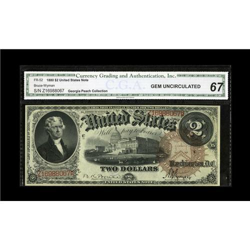 <B>Fr. 52 $2 1880 Legal Tender CGA Gem Uncirculated 67.</B></I> Nicely margined with bright surfaces and plenty of dazzling color.