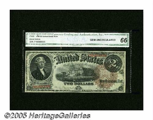 <B>Fr. 52 $2 1880 Legal Tender CGA Gem Uncirculated 66.</B></I> A handsome example of this large brown seal $2 Legal type.